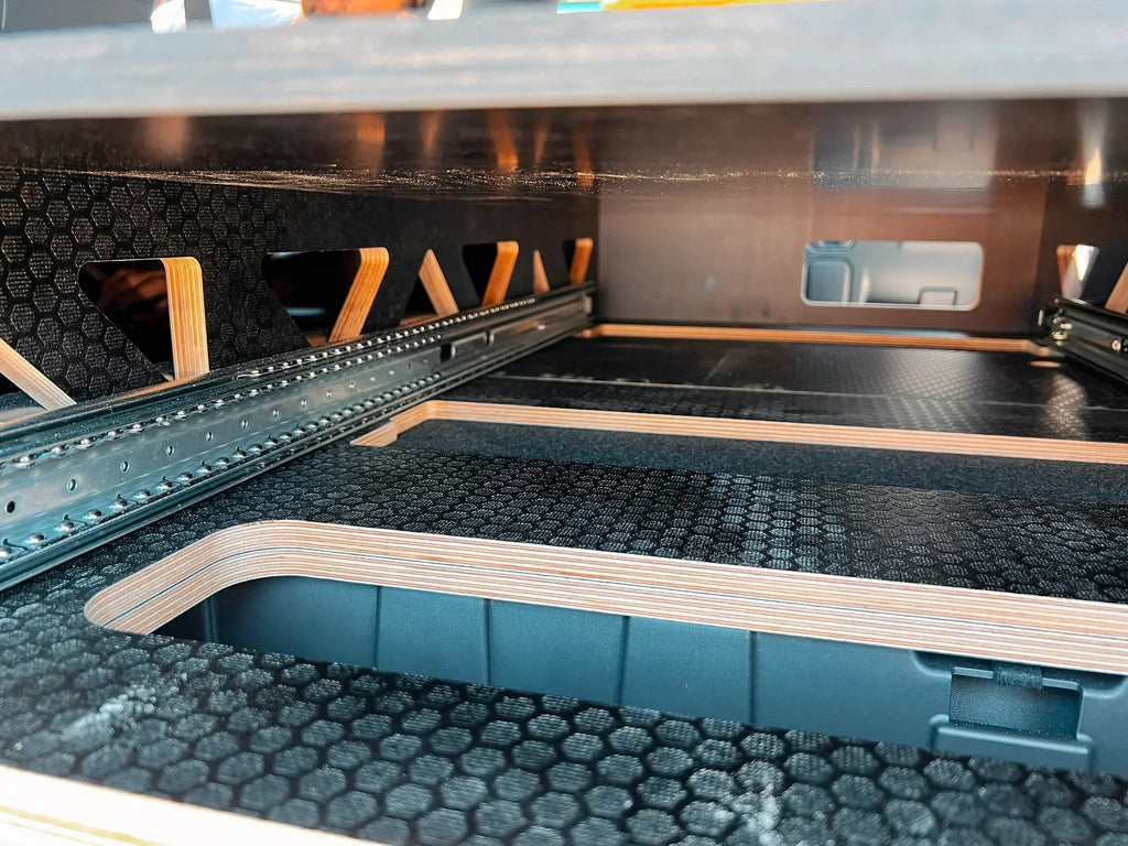 Our kit features two 39" slide-out drawers equipped with heavy-duty 250lb-rated, lock-in/lock-out drawer slides. Each 4.5" deep drawer includes two removable dividers, helping you keep your gear organized and secure for any adventure.