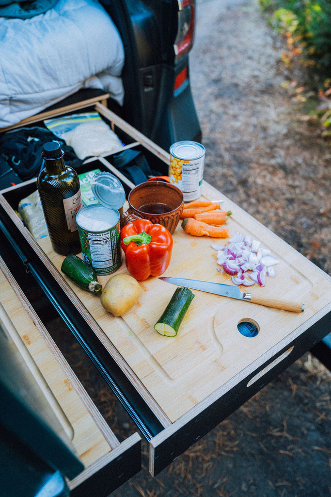 This kit will build dual 36" slide out drawers with locking drawer slides. Inside each drawer are 2 removable dividers to organize your supplies. You can choose between 3 options of false tops to turn each drawer into a cooking or workspace.