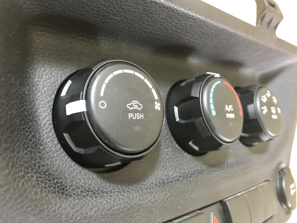 Replacement climate control rings for the 2011-2018 Wrangler JK. Does not fit 2007-2010 JK, or 2018+ JL. Injection molded of high strength and impact resistant ABS plastic. Clear indicator lights up the same color as OEM and provide tactile feedback Easy pull off/press on installation. Factory center buttons are re-used. Made in USA.