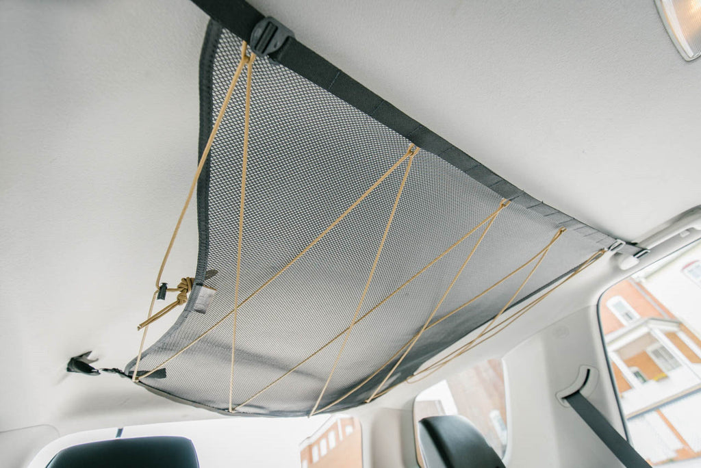 In our ongoing effort to maximize potential space in your vehicle, we saw a new frontier; your ceiling! The 4Runner Attic is made of mil-spec mesh and attaches to the grab handles with G-hooks. It can be clipped and unclipped as needed. Now you can store stuff in that vast space above your passenger's heads! And speaking of — the attic is adjustable. The corners can be tightened so that it doesn't get in the way of your passengers. That being said, we recommend this attic for only light-weight items such as coats, blankets, sleeping bags, or clothing. So if you decide to stow a bowling ball above your mother-in-law's head, we are NOT legally responsible for the resulting injuries!