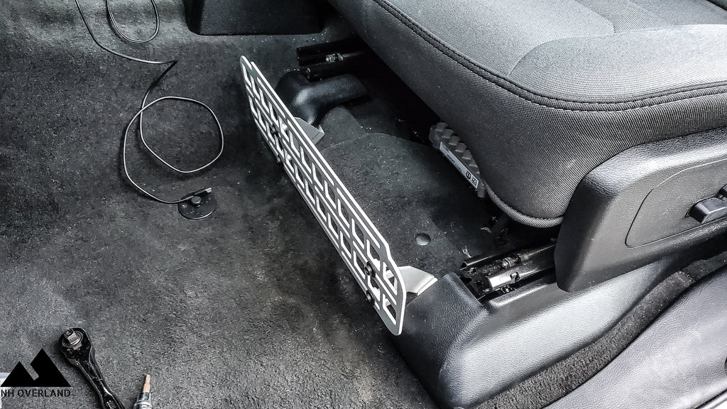 Front Seat Gear Panels mount behind the front legs of the driver and/or passenger side* seat/s keeping your you gear within reach. NH Overland Gear Panels allow for mounting a verity accessories, from Molle pouches, First aid kit, flash lights, fire extinguishers, or a holster. NH Overland Seat Front Gear Panels require no modification for installation.