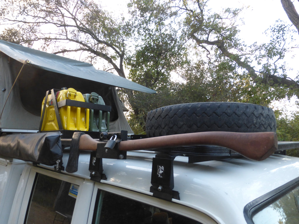 The Eezi-Awn K9 Roof Rack System comes with a complete array of bolt on accessories.  Jerry Can holders, Axe mounts, Shovel mounts, Hi-Lift Mounts, Max Trax Mounts, Awning Mounts, Under Rack Table mounts, and much more.  Take a look at the accessories page to see all our options.