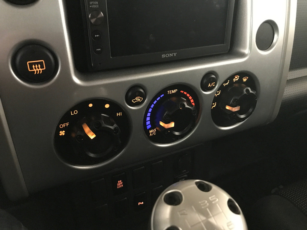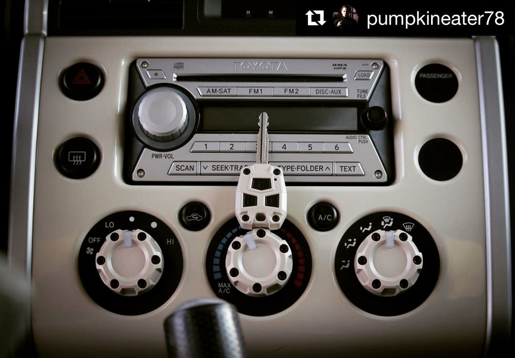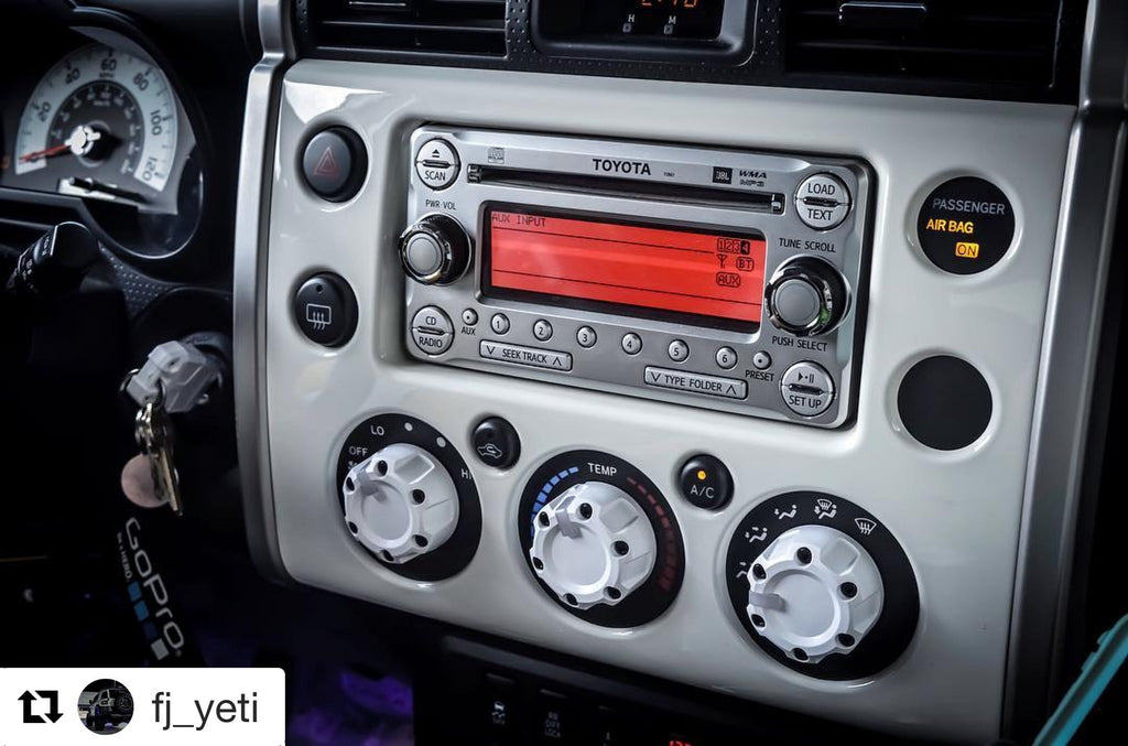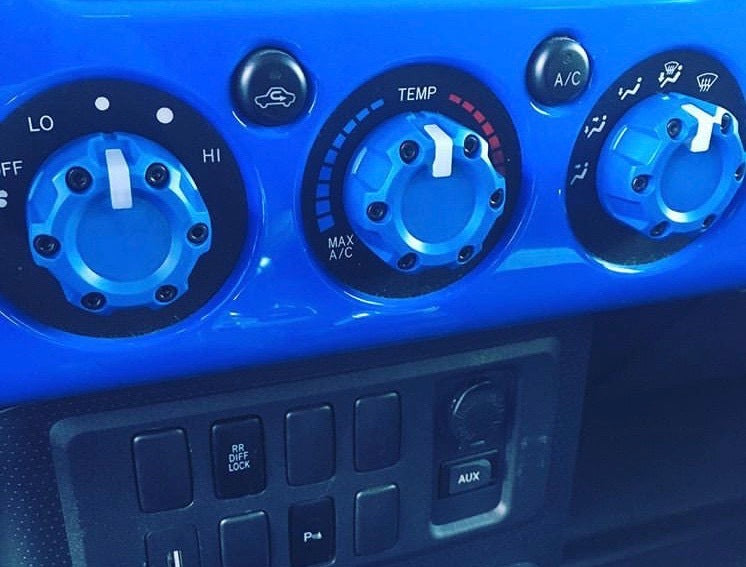 Replacement dial style climate control knobs for the 2007+ FJ Cruiser. Injection molded of high strength and impact resistant ABS plastic. Socket head cap screws for rugged good looks. Clear indicator lights up the same color as OEM and provides tactile feedback. Assembly requires the metal clips to be removed from the OEM knobs and placed into the AJT knobs for a snug OEM like fit, pull off/press on. Assembly requires a small screwdriver or needle nose pliers, dental pick, etc (not included) to remove clip and 7/64" allen key (included) to install screws. Made in USA.