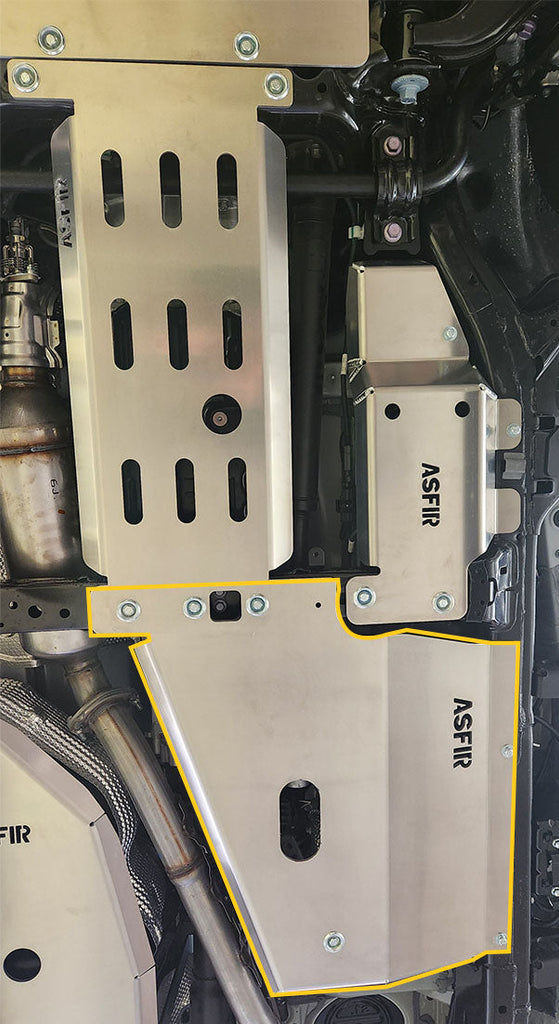 The Toyota Land Cruiser Prado 250 Transfer Case Skid Plate, designed for diesel models, is manufactured from precision laser-cut 1/4" (6 mm) aluminum. Engineered for strength and clearance, it shields the transfer case from off-road damage while maintaining a precise vehicle-specific fit and simple bolt-on installation.