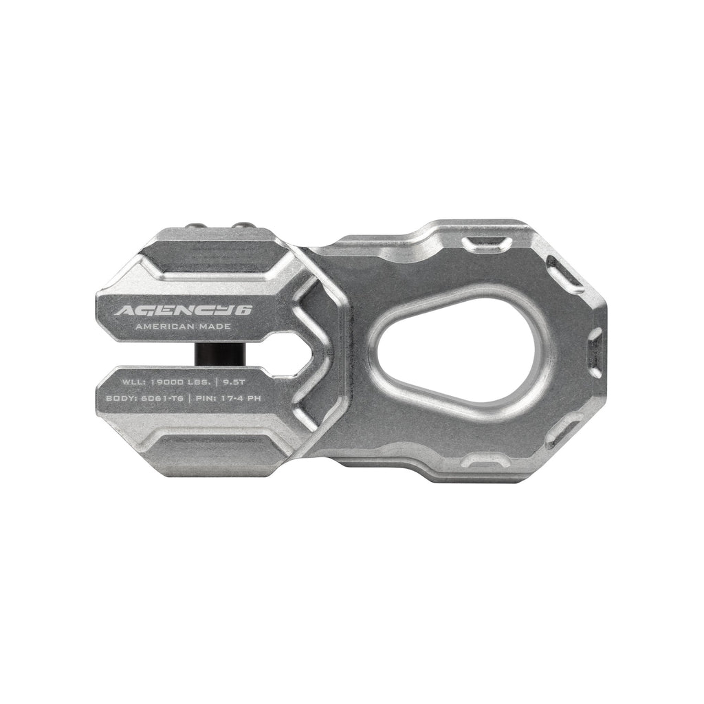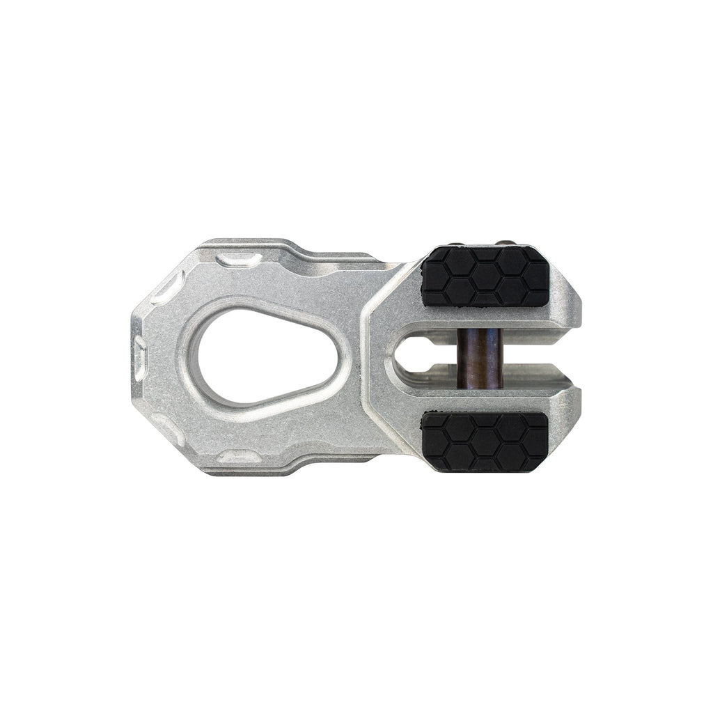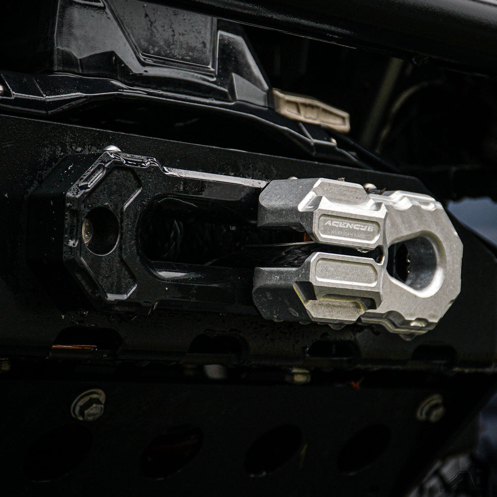 Field serviceable winch attachment made from US Certified 6061 T6 CNC machined aluminum with a 17-4 hardened stainless pin.