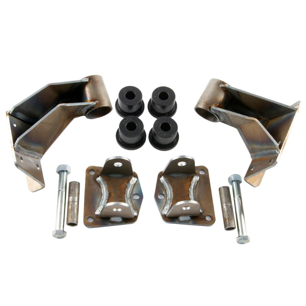 In most applications, our "Bomb Proof" motor mounts do not need modifications. Zinc-plated, this motor mount kit is for those of you who need serious protection from the elements (and they look ultra trick!). Plus, the no-paint version of our motor mount kit is for those of you who want to save some money and paint the mounts yourself. Black polyurethane bushings insulate from steel to steel contact. M.O.R.E. also offers replacement body mount parts.