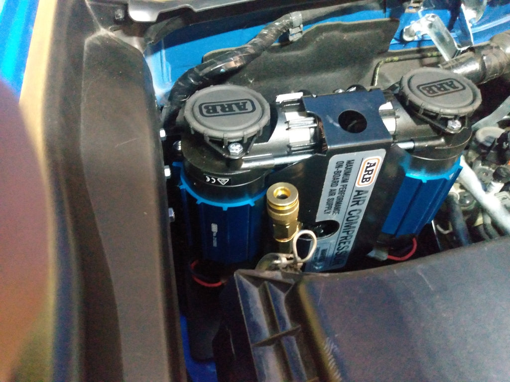 With the ARB twin air compressor you can air up a 35" tire from 10 to 20 pounds just under 1 minute so you can get back on the road quickly.  Easy install using factory holes. Powder coated black or red. Will not fit with California emission packages, ABS brake system, battery, or anything else that is on the passenger side inner fender.