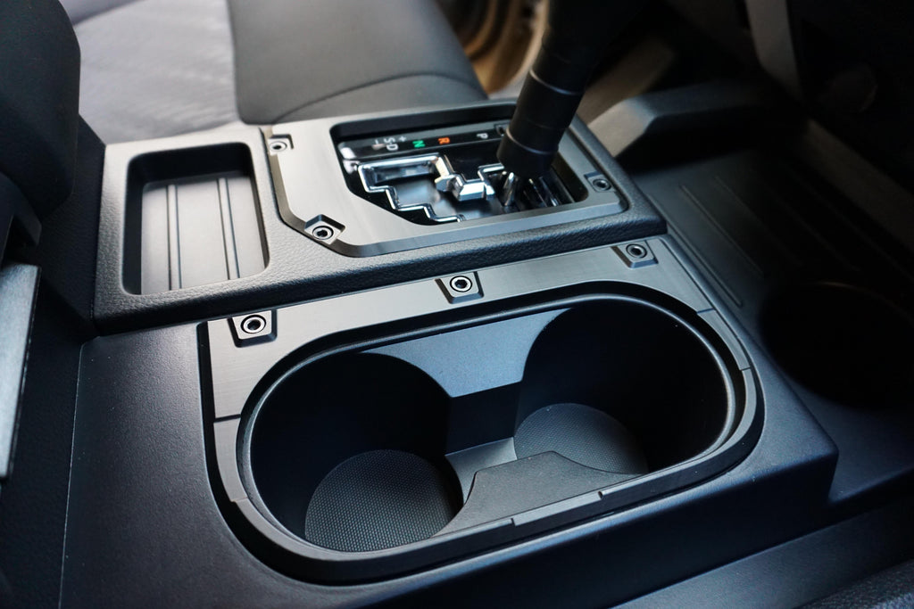 Cup holder and shift knob trim rings for the 2014-2021 Tundra with console shifter. Injection molded of high strength and impact resistant ABS plastic. Secured with socket head cap screws for a durable and rugged look.